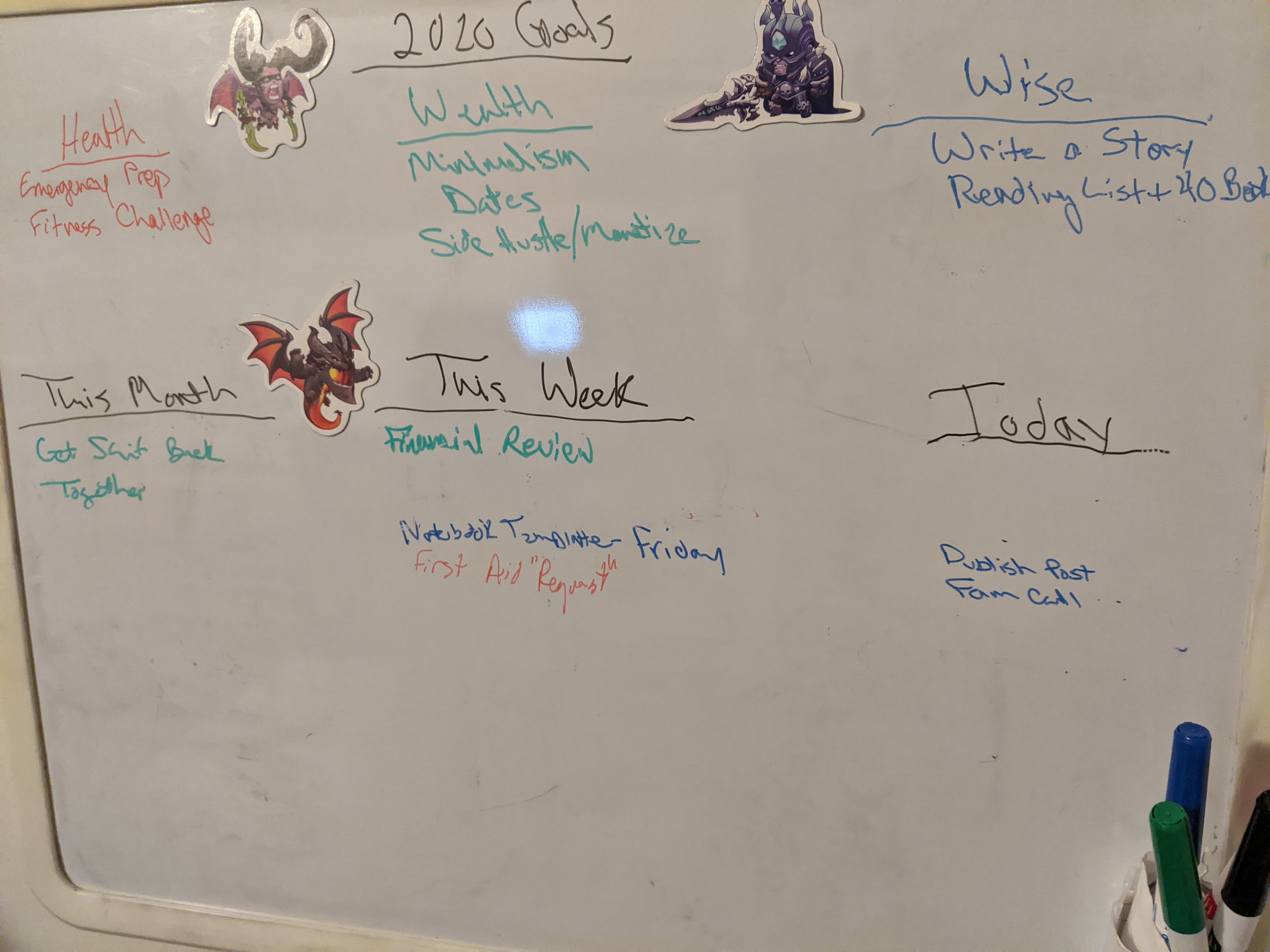 For example, this week, I’d like to have ordered a first aid kit as part of my goal for enacting an emergency plan. The weekly goal is to order the supplies for one, but one of my daily goals was simply to reach out to a friend and ask a question I had for him. The daily goal helps complete the weekly goal, and the weekly assists the annual.